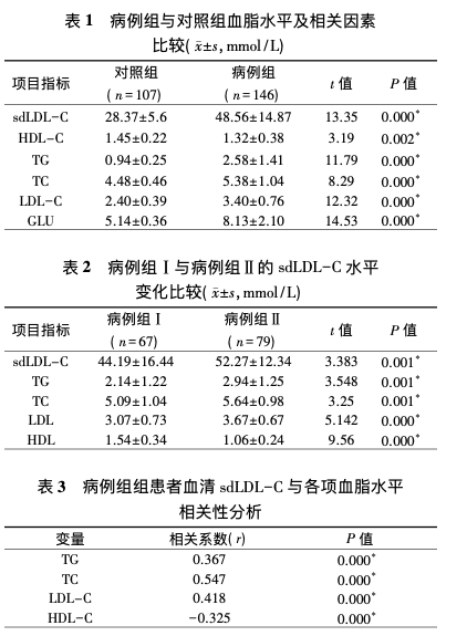 齊齊哈爾醫(yī)學(xué)院附屬第三醫(yī)院的楊秀靜等[6],將146例T2DM患(其中男85例,女61例;年齡30~70歲)中單純T2DM患者67例為病例組Ⅰ,T2DM及并發(fā)癥患者79例為病例組Ⅱ;另選擇同期健康體檢者107名作為對照組。兩組均進(jìn)行sd LDL-C、GLU、TC、TG、LDL-C、HDL-C檢測。觀察T2DM及其并發(fā)癥患者血清中sdLDL-C水平變化情況并分析其臨床應(yīng)用價(jià)值。研究結(jié)果表明,sd LDL-C在T2DM患者中升高明顯,sd LDL-C與TG、TC、LDL-C呈正相關(guān)與HDL-C呈負(fù)相關(guān)。觀察sd LDL-C的變化情況可用于預(yù)測T2DM并發(fā)癥病變發(fā)生風(fēng)險(xiǎn)。