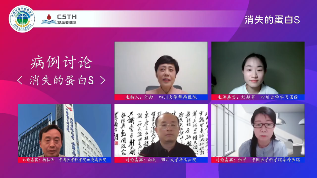 本期《病例討論:“消失”的蛋白S》邀請到了來自四川大學(xué)華西醫(yī)院的劉超男老師作為主講嘉賓,由四川大學(xué)華西醫(yī)院江虹教授擔任本期主持人,特邀中國醫(yī)學(xué)科學(xué)院血液病醫(yī)院楊仁池教授、四川大學(xué)華西醫(yī)院向兵教授、中國醫(yī)學(xué)科學(xué)院阜外醫(yī)院張洋老師三位討論嘉賓。