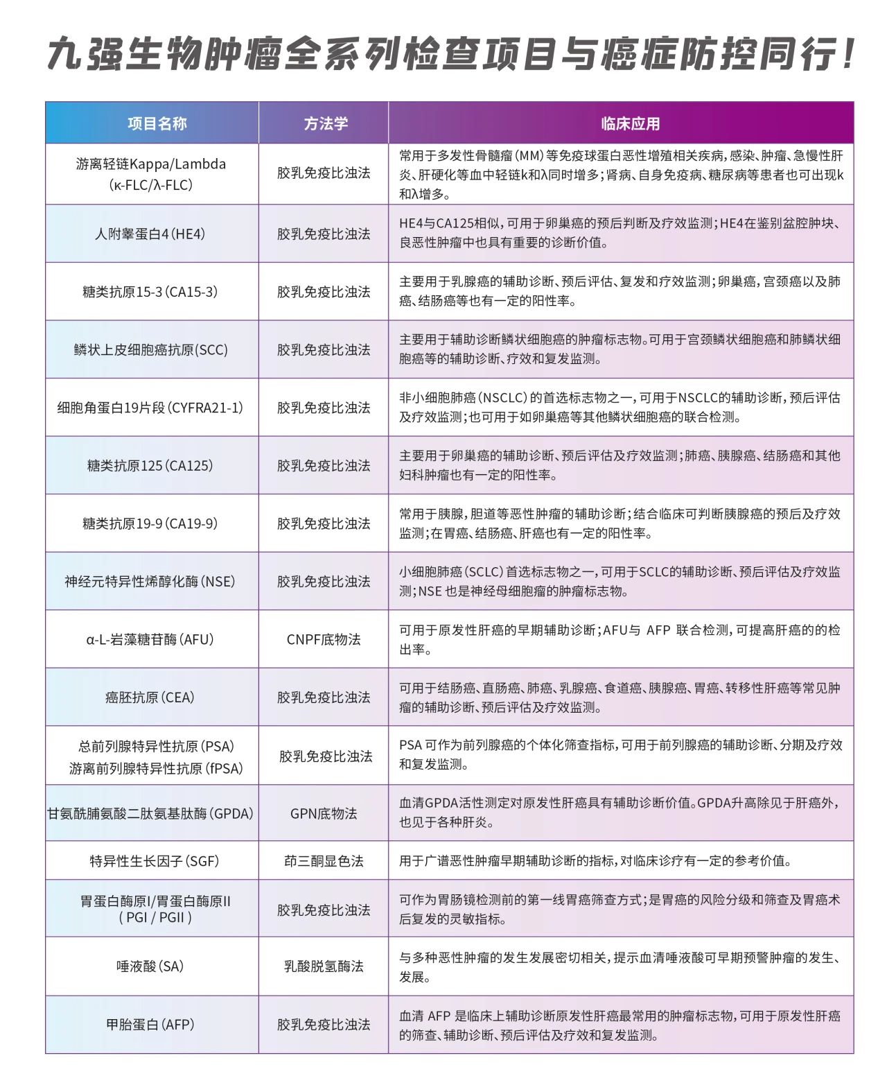 九強生物已開發(fā)出全面的生化平臺腫瘤標志物,試劑各項性能均能滿足臨床用戶需求,與主流進口化學(xué)發(fā)光相關(guān)性良好,實現(xiàn)批量快速測定的同時有效節(jié)約了用戶成本。
