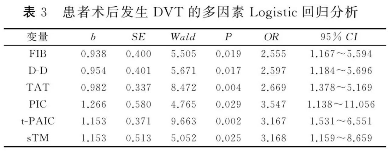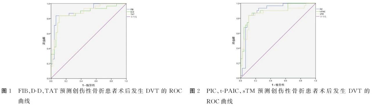 本次研究顯示,DVT組FIB、D-D、TAT、PIC、t-PAIC、sTM 顯著高于非DVT組,提示FIB、D-D、TAT、PIC、t-PAIC、STM可能與創(chuàng)傷性骨折患者術(shù)后DVT風(fēng)險有關(guān)。